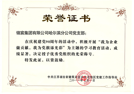 在建黨90周年之際,東北臨時黨支部以“我為企業做貢獻,我為黨旗添光彩”為主題,積極開展專題學習教育活動,每周組織黨員集中學習,傳達和落實黨組織的精神,取得了較好的成果。經江蘇省建設廳東北地區黨建工作站審核、評選,東北臨時黨支部被授予優秀黨組織的光榮稱號,同時哈爾濱分公司錢明同志被評為江蘇省駐東北地區優秀共產黨員。