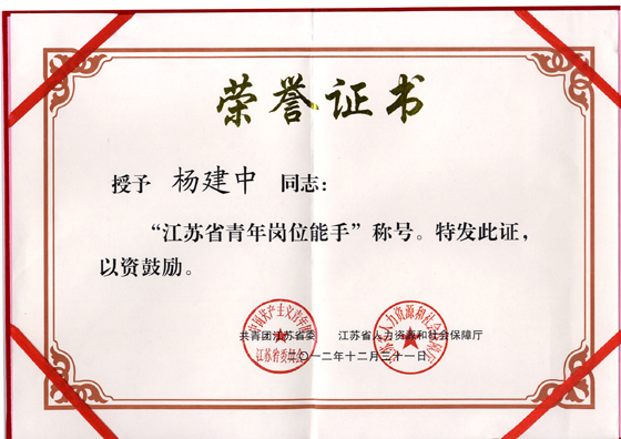 日前,從共青團(tuán)江蘇省委傳來喜訊,集團(tuán)公司海外分公司楊建中同志由于工作表現(xiàn)突出,成績顯著,被共青團(tuán)江蘇省委、江蘇省人力資源和社會保障廳聯(lián)合授予2012年“江蘇省青年崗位能手”稱號。