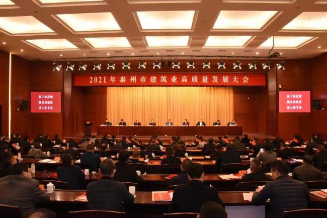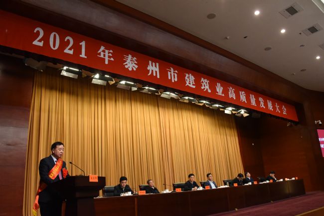 2021年3月3日,泰州市召開建筑業高質量發展大會,回顧總結全市2020年建筑業工作情況,研究布署2021年建筑業工作目標任務,推動全市建筑業高質量發展。市委副書記、市長朱立凡等政府主要領導;省住建廳總工程師施嘉泓;市人大市政協相關領導;市政府秘書長、分管副秘書長;各市區主要負責人;住建及其他相關部門和單位等出席;集團公司董事長李煥軍受邀參加了此次會議,并在大會上做表態發言。