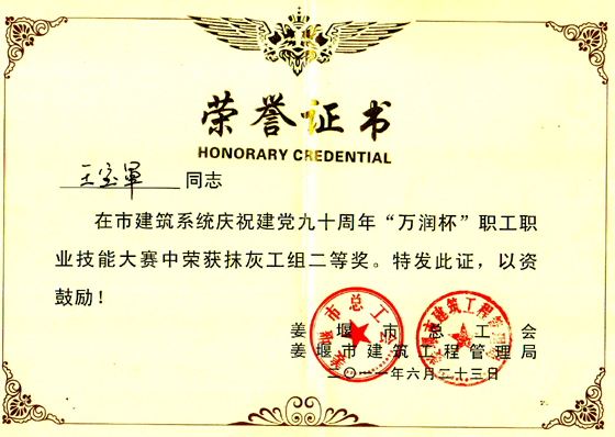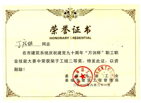 近日,在由姜堰市總工會、姜堰市建筑工程管理局、中國建筑工會姜堰市委員會、姜堰市建筑行業協會組織的全市建筑系統開展慶祝建黨90周年“萬潤杯”職工職業技能大賽中,我集團公司李煥寶項目部架子工丁虎根、儲桂華項目部抹灰工王寶軍分獲大賽二等獎。