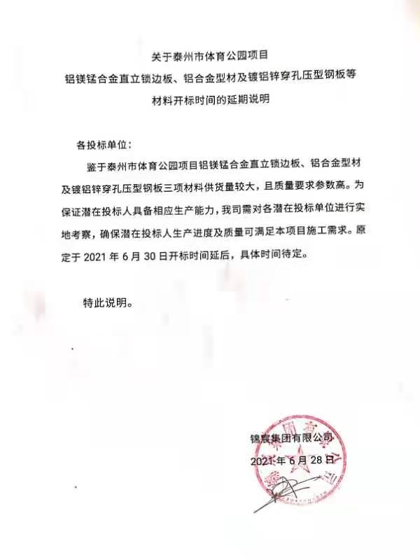 泰州市體育公園項目-鋁鎂錳合金直立鎖邊板、鋁合金型材及鍍鋁鋅穿孔壓型鋼板等延期開標說明