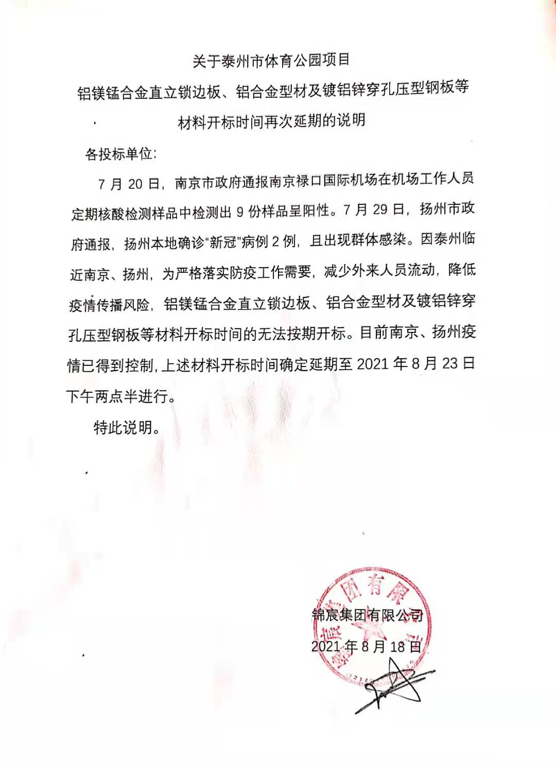 泰州市體育公園項目-鋁鎂錳合金直立鎖邊板、鋁合金型材及鍍鋁鋅穿孔壓型鋼板等再次延期開標說明