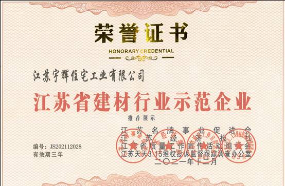 近日,由江蘇名牌事業促進會、江蘇經濟報社、江蘇省質量工作宣傳活動組委會、江蘇天天3.15維權投訴監督跟蹤調查辦公室聯合評選的“江蘇省高質量發展優秀企業”、“江蘇省建材行業示范企業”出爐,江蘇宇輝住宅工業有限公司成功入選。