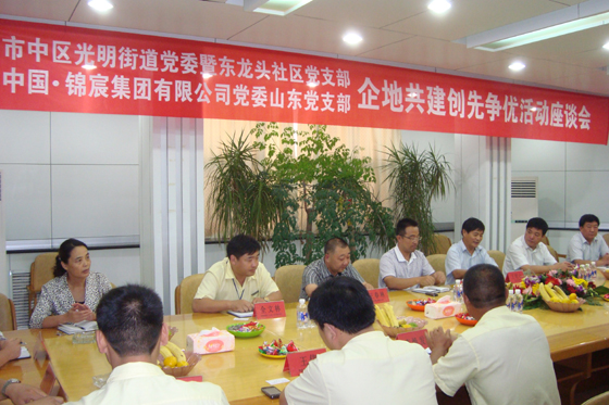 9月14日下午,由錦宸集團有限公司黨委山東黨支部與棗莊市中區光明路街道黨委暨東龍頭社區黨支部聯合召開了“企地共建創先爭優活動座談會”,光明路街道辦王衍山書記首先介紹了駐地的情況和近年來的工作進展,姜堰市建筑工程管理局副局長沈翠龍、集團公司黨委書記王春林,介紹了我公司近年來取得的的驕人業績以及公司未來發展的方向。