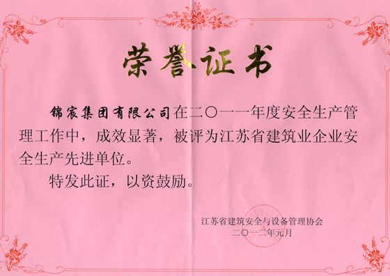 2012年元月10日,江蘇省建筑安全與設備管理協會成立25周年慶祝大會暨2012年工作會議在南京召開,來自全省300名會員單位代表參加了會議。省住房城鄉建設廳副廳長、省建管局局長徐學軍和中國建筑業協會機械管理與租賃分會會長賈立才以及江蘇省建筑行業協會會長高學斌、省裝飾行業協會會長毛家泉等出席會議并講話。會上,集團公司被表彰為“江蘇省建筑業企業安全管理先進單位”。