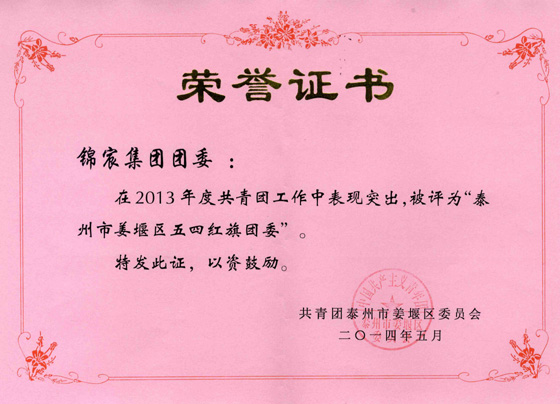 近日,集團公司團委榮獲2013年度泰州市姜堰區(qū)“五四紅旗團委”稱號。據(jù)悉,全區(qū)共有直屬團委50多個,非直屬團委若干,此次評選僅有6個基層團委獲此殊榮。“五四紅旗團委”是基層團組織的先進典型,同時也是團區(qū)委授予基層團組織的最高榮譽,這是對我公司共青團工作的肯定,更是對我公司共青團工作的極大鼓勵。
