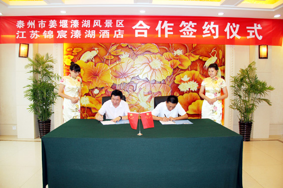 簽約儀式上,溱湖風景區開發建設有限公司王劍經理,錦宸集團有限公司、江蘇錦宸溱湖酒店有限公司董事長李煥軍分別代表雙方在合作協議書上簽字。這標志著江蘇錦宸溱湖酒店正式入駐風景區。