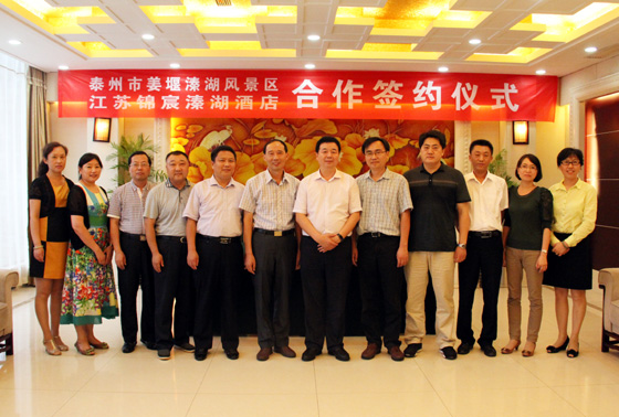 9月2日,泰州市姜堰溱湖風景區與江蘇錦宸溱湖酒店有限公司的合作簽約儀式在溱湖會務中心舉行。溱湖風景區管委會黨工委書記、主任秦永金及管委會領導班子,溱湖風景區開發建設有限公司王劍經理,集團公司董事長李煥軍、黨委書記王春林,江蘇錦宸溱湖酒店有限公司總經理梅林女士及管理班子主要成員出席簽約儀式。
