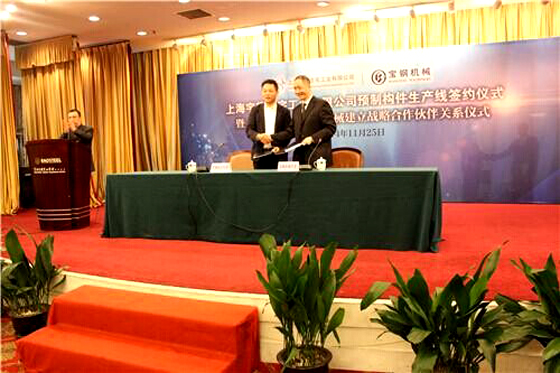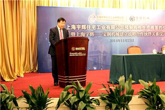 11月25日上午,上海宇輝住宅工業有限公司預制構件生產線簽約儀式暨上海宇輝--上海寶鋼工業技術有限公司機械分公司戰略協議簽約儀式,在上海寶鋼集團寶山賓館友誼會堂召開。寶鋼工程集團代表,上海多家建筑單位代表,本地多家知名民營企業代表,以及新聞媒體代表等參加會議,集團公司董事長李煥軍出席簽約儀式并講話。