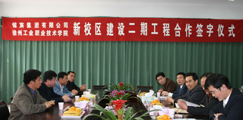 錦宸集團有限公司 新校區建設二期工程合作簽字儀式在徐州舉行 徐州工業職業技術學院 4月7日,錦宸集團有限公司與徐州工業職業技術學院在學院新校區舉行二期工程合作簽字儀式,集團公司董事長李煥軍、徐州工業職業技術學院院長周立雪分別在合作協議上簽字。這是雙方經過多輪協商后開展校企合作、實現互惠雙贏的重要成果。 根據協議,徐州工業職業技術學院新校區二期工程由錦宸集團有限公司以BT方式承建,整個工程分圖書館、體育館、辦公樓、實驗樓,總面積8萬平方米,總造價約1億元,預計將于5月20日開工。