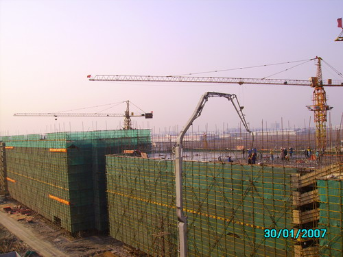該工程是外資項目,總建筑面積10.3萬M2,為全框架結構。蘇州分公司于2006年10月開工承建了一期工程4.3萬M2,共6幢6層職工宿舍樓,工程量大,工期緊,業主要求242個日歷天全部竣工。工程開工伊始,蘇州分公司經理王蔚多次召集技術骨干,共同研究施工方案,將工程量由各施工班組分解承包,并抽調施工經驗豐富的技術人員充實到項目一線,共同研究解決施工中的難題。項目部每天早上召集班組長進行技術交底,確保工程質量。經過400多名工人的共同努力,D6、D9、D12三幢樓實現提前封頂,D7、D10、D13三幢樓施工進展順利。