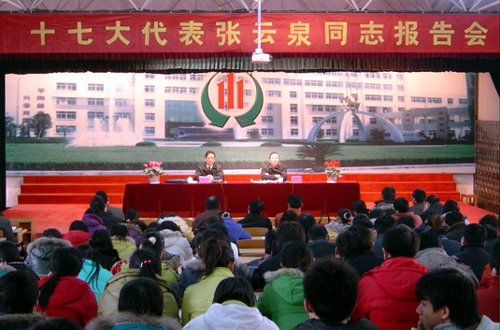 學校黨總支書記、校長王加珍主持報告會。他指出,全校廣大師生要結合學習張云泉同志的專題報告,更加深入的學習和更加廣泛的宣傳黨的十七大精神,進一步統一思想、鼓舞斗志,把智慧和力量凝聚到落實黨的十七大提出的重大戰略部署和各項重大任務上來,切實推動學校各項事業的發展,為構建和諧民興作出自己的努力。同時,在學習和討論張云泉同志的報告時,更要注意學習張云泉同志本人,他是一位優秀的共產黨員,在20多年的信訪工作中,始終關心群眾疾苦,情系百姓冷暖,以赤子之心和滿腔熱忱為政府分憂,為人民解難,在平凡的工作崗位上做出了不平凡的貢獻。全體民興人都要學習張云泉同志的這種精神,在民辦教育這塊園地上刻苦磨練,辛勤耕耘,為早日把我校辦成“全省一流、全國知名”的民辦學校貢獻力量。
