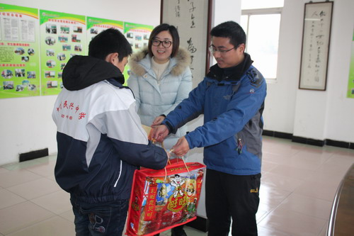 2月22日上午,校團委書記顧娟娟、團委副書記朱方喆、團委委員陸海雯等將新年大禮包(新華書店購書卡、新年小禮物)送到了該校初一13班費同學手中,并與費同學進行了簡短的交談,鼓勵他好好學習、天天向上。