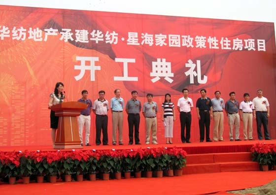7月28日,由華紡地產承建的朝陽區2010年首批政策性住房——華紡星海家園舉行了隆重的開工典禮。朝陽區住房和城鄉建設委員會黨委書記兼紀委書記孫梅女士、國資委紡織機關服務中心黨委書記徐偉先生、華紡房地產開發公司總經理周增根、錦宸集團董事長李煥軍、北京華瑞興業房地產開發公司常務副總經理黃蘇成、北京星海鋼琴集團董事長趙惠臣等領導蒞臨現場參加奠基儀式。