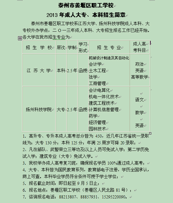 泰州市姜堰區職工學校2013年成人大專、本科招生簡章