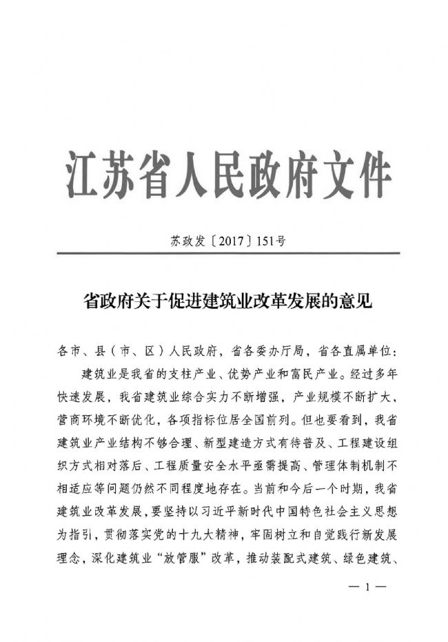 蘇政發[2017]151號省政府關于促進建筑業改革發展的意見